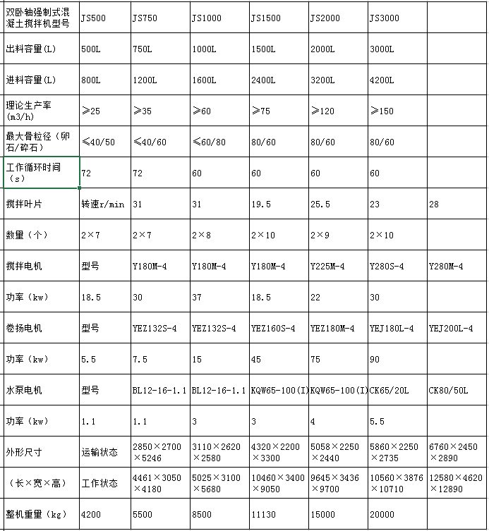 JS型雙臥軸強制式混凝土攪拌機技術參數: