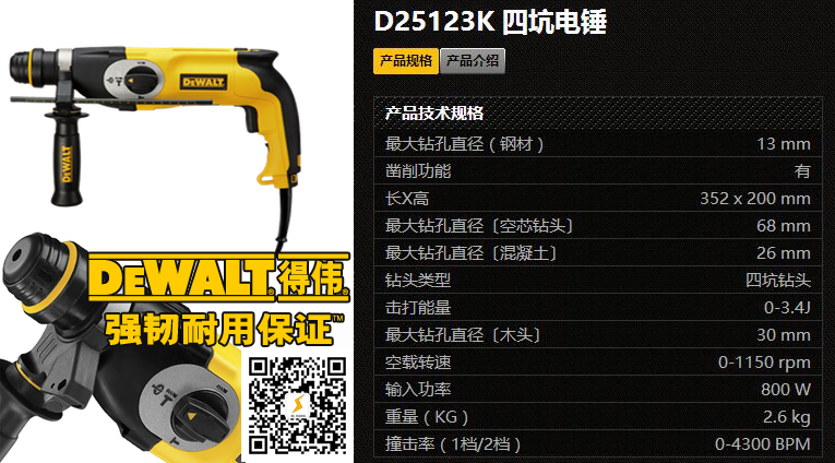 得偉DeWALT 26MM 2KG重型四坑組合式電錘D25123K