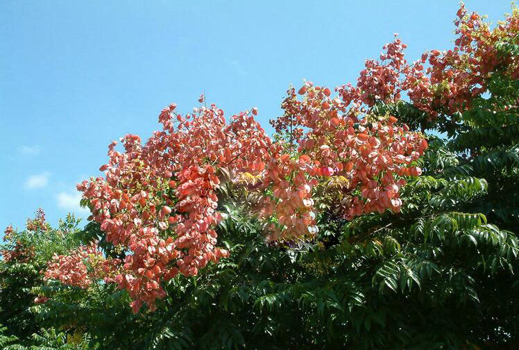 欒樹因其適應性強、速生、病蟲害少,樹形高大優美,加之夏末秋初鮮黃色花朵灑滿樹冠,深秋季節酷似串串燈籠的紅色蒴果與鮮黃色秋葉交相暉映,近年來已躍身于城市園林行列。宜作庭蔭樹、行道樹及園景樹,也可用作防護林、水土保持及荒山綠化樹種。欒樹為落葉喬木,樹形端正,冠多傘形。枝葉繁茂秀麗,春季嫩葉紅色,夏花滿樹金黃色,入秋蒴果似盞盞燈籠,果皮紅色,絢麗悅目,在微風吹動下似銅鈴嘩嘩作響,故又名“搖錢樹”。種子可制成佛珠,故寺院中尤為常見。欒樹為溫帶,亞熱帶樹種。喜溫暖濕潤氣候;喜光,亦稍耐半蔭;喜生長于石灰巖土壤,也能耐鹽漬性土,耐寒耐旱耐瘠薄,并能耐短期水澇。深根性,生長中速,幼時較緩,以后漸快。對風、粉塵污染、二氧化硫、臭氧均有較強的抗性。枝葉有殺菌功能;花為優良的蜜源,并可提取黃色染料。   欒樹適應性強、季相明顯,是理想的行道、庭蔭等景觀綠化樹種,也是工業污染區配植的好樹種。被臺灣林學家推崇為應大力推廣的亞洲寶樹。欒樹屬有五種,我國產四種,在浙江和江蘇地區常見的分布較廣的欒樹為黃山欒樹,其耐寒性稍不及欒樹,但頂芽梢較欒樹發達,故假二叉分枝習性沒有欒樹明顯,;因此較易培養良好的樹形。近年來被業內人士普遍看好。
