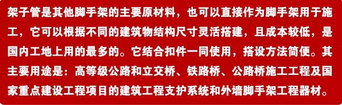 架子管是人們在建筑或施工行業當中的專用術語,可以在建筑工地和施工現場等起到不同的作用:可以使工人更方便地到達無法直接施工的較高樓層;也可以為施工人員和路邊行人等提供安全的保障和外圍安全網維護及高空安裝施工等。架子管是由熱軋帶鋼經過工藝處理后卷成的產品,一般一捆為91根。也稱腳手管,腳手架鋼管。目前國家標準制腳手管每米重量為3.845kg,厚度為3.5mm。