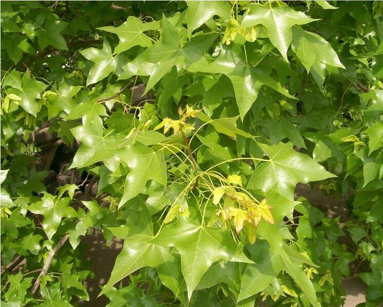 落葉喬木,高9-15m。樹皮粗糙,深褐色;小枝圓柱形,無毛,當年生枝淡紫綠色,老枝深紫色。葉對生;葉柄長2-4cm,淡綠色,無毛;葉片薄紙質或紙質,寬7-10cm,長5.5-8cm,通常5裂,中生裂片與側裂卵形或三角狀卵形,先端短急銳尖,尖尾長8-10mm,基部深心形或近心形,葉緣邊具緊貼細圓齒,上面綠色,無毛,下面淡綠色,基生脈5條,在兩面均顯著。圓錐花序頂生,無色;花雜性,雄花與兩性花同株,萼片5,綠色,長橢圓形,無毛;花瓣5,深綠色,長圓狀倒卵形;雄蕊8,花絲無毛,花藥淡黃色;花盤位于雄蕊外側;子房紫色,密被淡黃色長柔毛,花柱2裂,無毛,柱頭平展。翅果嫩時淡紫色,成熟后淡黃色,小堅果凸起近于球形,直徑約6mm,翅張開近于水平,中段最寬,常達1cm,連同小堅果長2-2.3cm。花期5月,果期9月。秋葉變亮黃色或紅色,適宜做庭蔭樹、行道樹及風景林樹種。