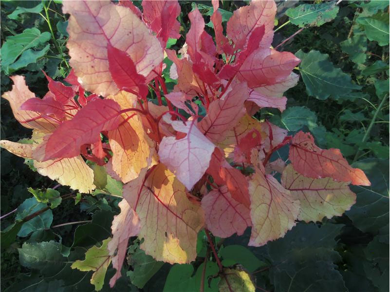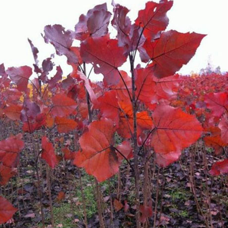 ? ? ? ?金紅楊是第三代中華紅葉楊 。 金紅楊屬美洲黑楊,葉片顏色從每年2月底發(fā)芽期的鮮紅色逐步變?yōu)殚偌t色、金黃色,下部葉片變?yōu)辄S綠色,直至每年11月落葉期葉色再轉(zhuǎn)變?yōu)榻奂t色,葉柄、葉脈、干莖、新梢始終為紫鮮紅色,金紅楊色澤亮麗、多變、誘人,在整個(gè)生育期始終能保持一樹三色,且顏色亮麗,能給人一種嶄新的視覺沖擊力,是中紅楊、全紅楊和其他彩葉樹種的無法比擬的,為世界罕見,觀賞價(jià)值,經(jīng)濟(jì)價(jià)值頗高,是國內(nèi)外截止目前發(fā)現(xiàn)的極好的彩色速生樹種。