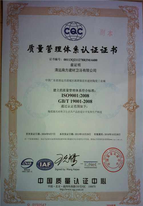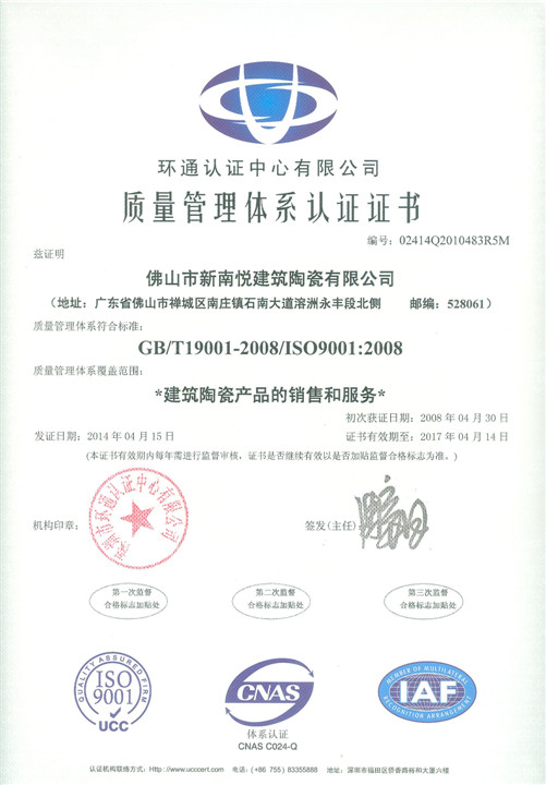 新南悅陶瓷以科技創新和產品創新享譽業界,以“為消費者營造空間之美和生活之悅”為己任,全面通過ISO9001:2008國際質量管理體系認證、國家強制性3C認證、中國環保產品認證,先后榮獲廣東省名牌產品、中國陶瓷行業名牌、中國馳名商標等多項殊榮。