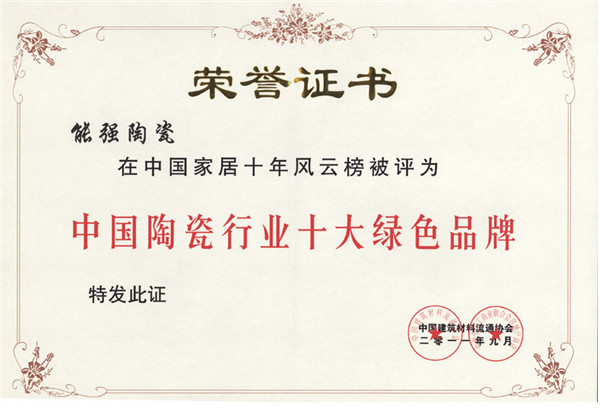 公司聚集了過百名的研發精英以及管理人才,無論產品的品種開發,品質監控和營銷策略,都走在同行的前列。我們積極開展與國內外著名研究所的技術交流合作,不斷推出創新市場的產品,多項產品通過省級新產品鑒定。能強陶瓷先后獲得“ISO9001:2008質量管理體系認證”、 “國家3C強制性認證”、“ISO14001:2004環境管理體系認證”、 “中國陶瓷行業名牌產品”、 “建材環保產品認證”、 “廣東省名牌產品”、 “中國馳名商標”、“廣東省著名商標” 、“中國家居行業十大影響力品牌”、 “中國陶瓷行業十大綠色品牌”、 “2013陶瓷十大品牌”等多個國家級榮譽稱號。