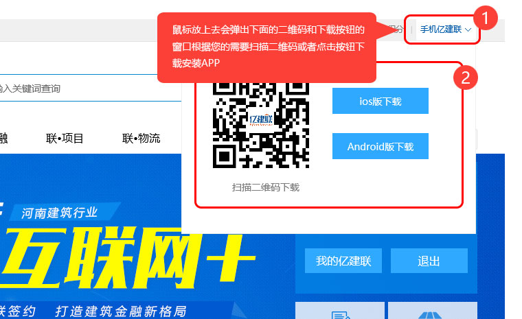 第一種方式:打開億建聯(lián)官方網(wǎng)站,在網(wǎng)站右上角,鼠標(biāo)放上“手機(jī)億建聯(lián)”會(huì)彈出掃描的二維碼和下載按鈕,選擇您最習(xí)慣的方式安裝APP到您的手機(jī)。